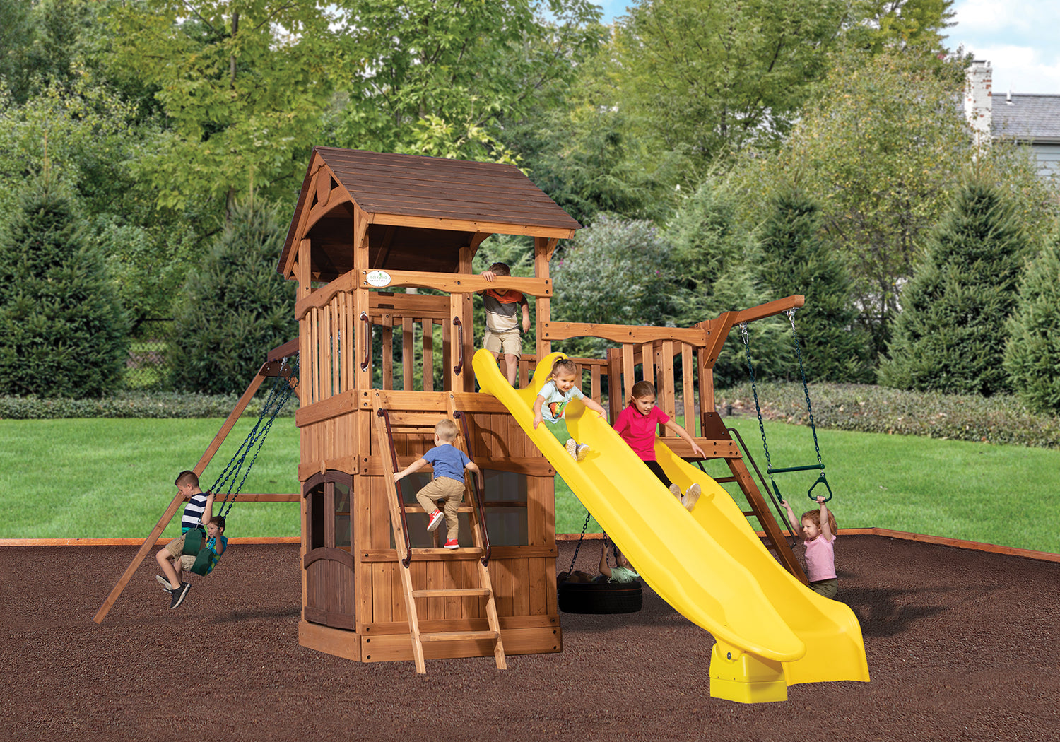 Con la torre Adventure Summit XL, escalera combinada, columpio de neumático y dos toboganes emocionantes, este conjunto reúne variedad, desafío y juego imaginativo, todo en una estructura de hermosa fabricación.